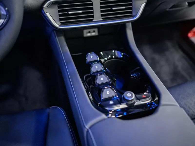 Cần số dạng nút bấm. Bệ tỳ tay kích thước lớn có thể trở thành bàn làm việc khi cần. Hệ thống đèn viền nội thất không chỉ mang đến cảm giác dễ chịu cho người ngồi, mà còn tăng thêm tính sang trọng cho mẫu xe điện nguồn gốc Việt Nam.